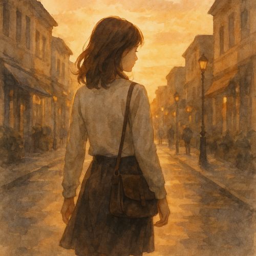 例:「水彩画風で、夕暮れの街を歩く女性。柔らかい光と落ち着いた雰囲気で」
