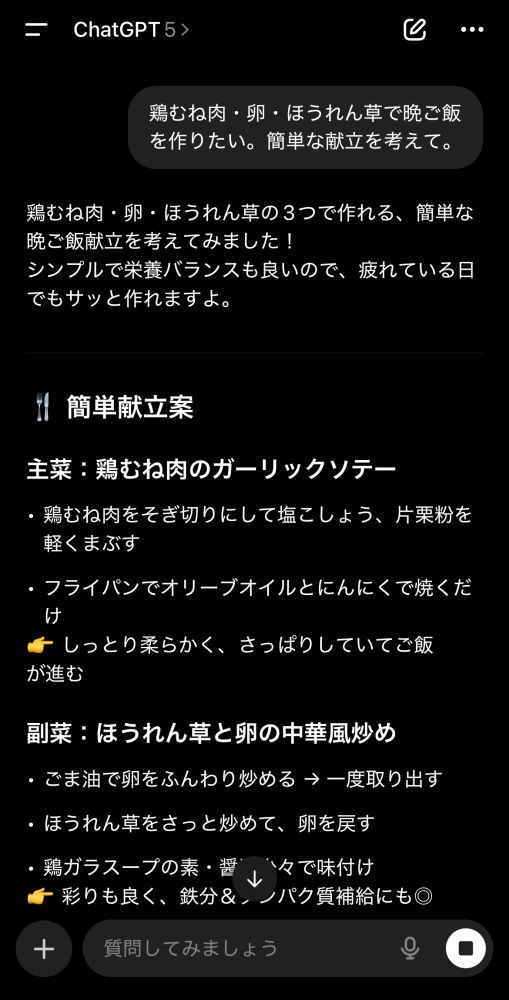 「鶏むね肉・卵・ほうれん草で晩ごはんを作りたい。簡単な献立を考えて」と入力すると、丼ものや炒め物など複数のレシピを提案してくれます。