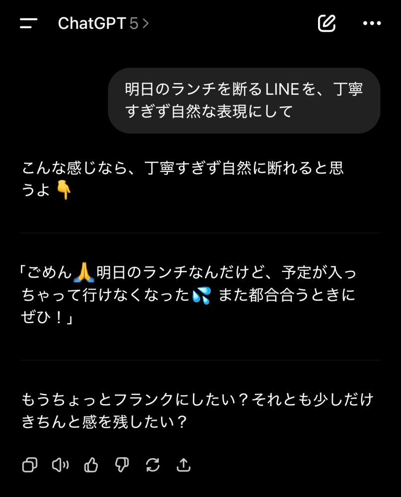 「明日のランチを断るLINEを、丁寧すぎず自然な表現にして」と伝えると、柔らかくて感じの良い文例を提案してくれます。
