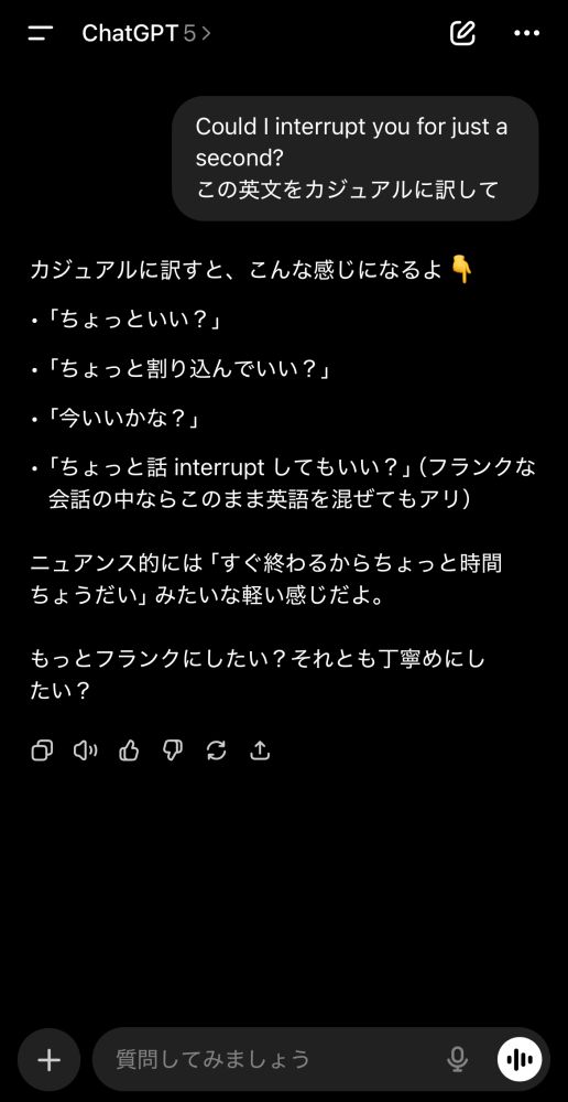 例えば「この英文をカジュアルに訳して」と頼めば、友達同士の会話に合う自然な表現に。