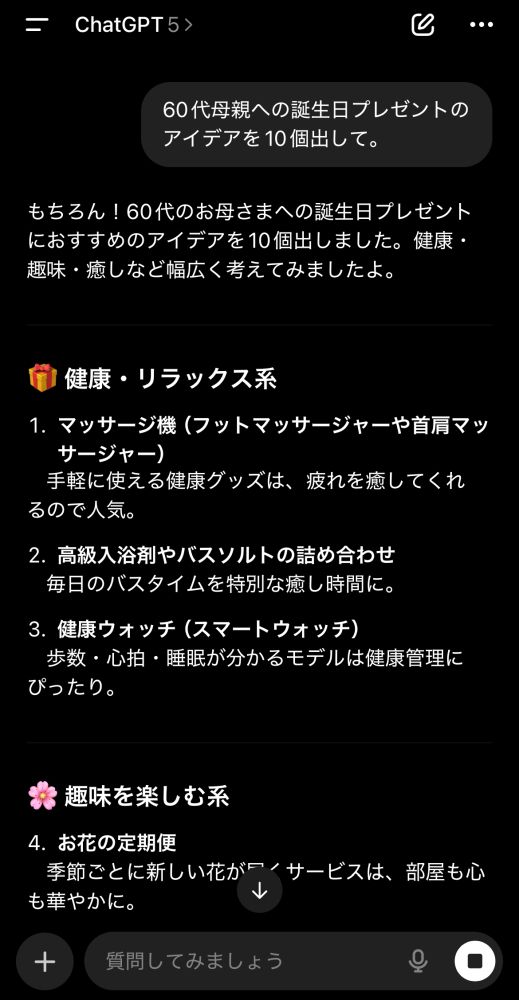 「ブログのタイトルを考えて」「誕生日プレゼントのアイデアを出して」と頼むと、良い感じのアイデアを出してくれますよ。