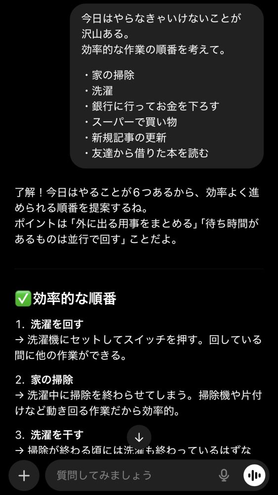 ChatGPTに「やらなければならない事」を伝えると、リスト化してくれたり、効率の良い流れを提案してくれますよ。