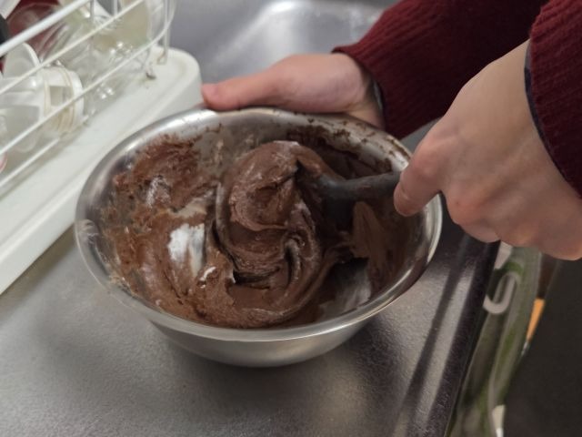 何かを作っていることに気づいた夫がやってきたので、代わりに混ぜてもらいます。(バレンタイン菓子なのに)